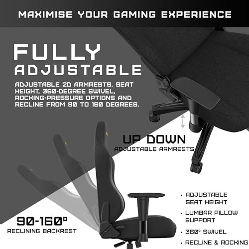 Fully Adjustable Gaming Setup: Adapt your pc gaming chair to suit you with 2D armrests, offering optimum comfort by supporting the forearm to relieve wrist pressure and muscle strain. The reclining heavy duty gaming chair tilts 90-160 degrees with angle lock at 4 different positions. Adjust the height of your game chair with high performance Class 4 Hydraulic Nitrogen Pistons.