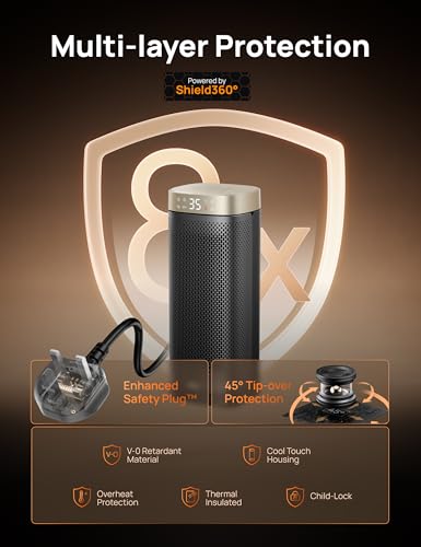 Peerless safety and reliability: Experience ultimate safety with this heater for indoor use, featuring the Shield360° system with tip-over and overheat protection, a 24-hour auto-off function, V-0 flame-retardant materials, and a safety plug.