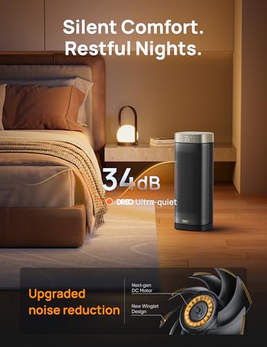 Whisper-quiet warmth for restful nights: DREO’s bedroom heater runs quietly, thanks to its brushless DC motor and winglet fan design that reduces turbulence. With noise levels as low as 34dB, it’s perfect for undisturbed sleep.