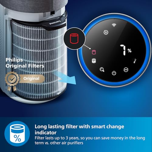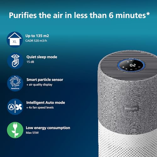 Philips Series 3000i Connected Air Purifier with Real Time Air Quality Feedback, Anti-Allergen, Combined HEPA + Carbon Filter Reduces Odours and Gases – AC3033/30, Grey/White