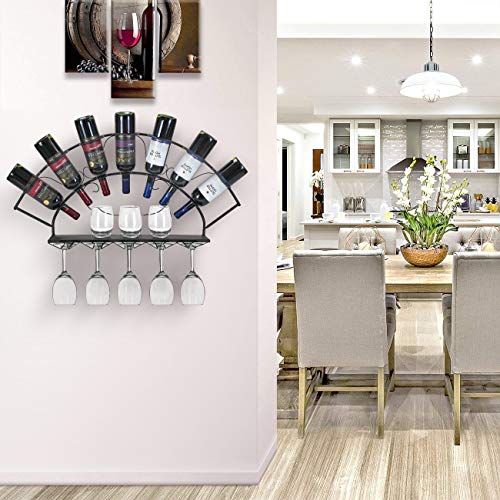 The wall-mount design makes this wine rack an excellent choice for any room where floor space is a premium. Store up to 7 standard bottles and 5 stemware glasses. Lightweight and sturdy. Made of metal with powder coated black finish. Wipes clean with cloth for lasting quality and years of use. Fits wide variety of home décor. Wine bottles and glasses NOT INCLUDED. Measures approximately 32.87″ L x 5.12″ W x 16.25″ H.
