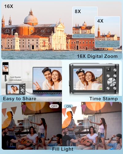 【16X Digital Zoom & Dual Camera】Compact digital camera supports 16x digital zoom, zoom can be achieved in the details of distant shots.Use the W/T button to zoom in or out for close-ups or far-away shots.Equipped with front and rear lens, switch to the front camera for easy selfies with just one click, and utilize the rear camera for creative video, easily unlocking various shooting skills.