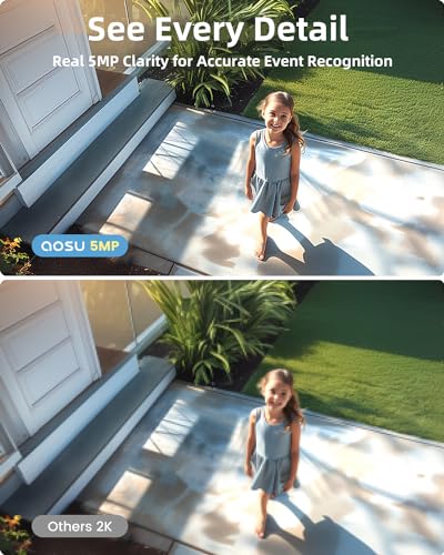 【5MP Ultra HD】aosu security camera outdoor increased by 40% from 2K resolution to 5MP. Capture a picture in crystal-clear detail for greater insight. With an integrated spotlight, you will see in the dark in colour night vision with aosu security camera.