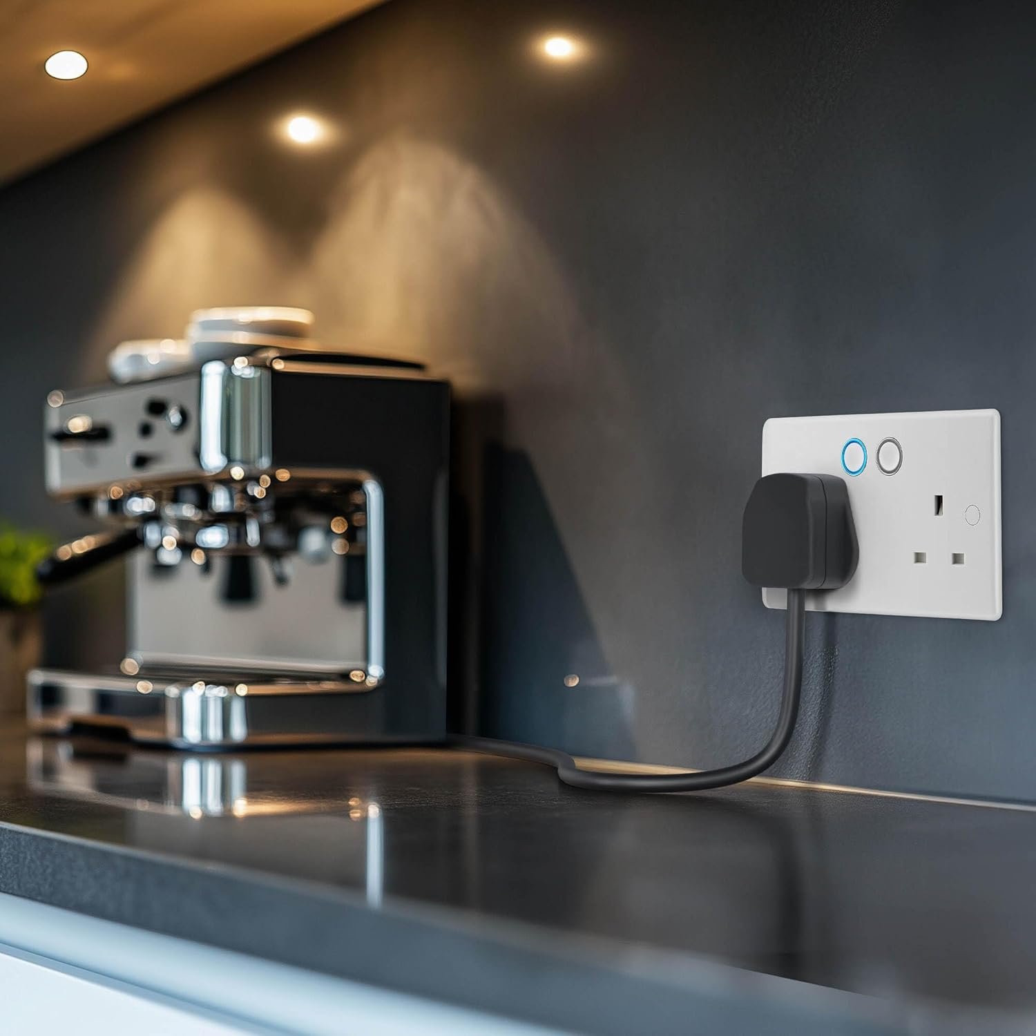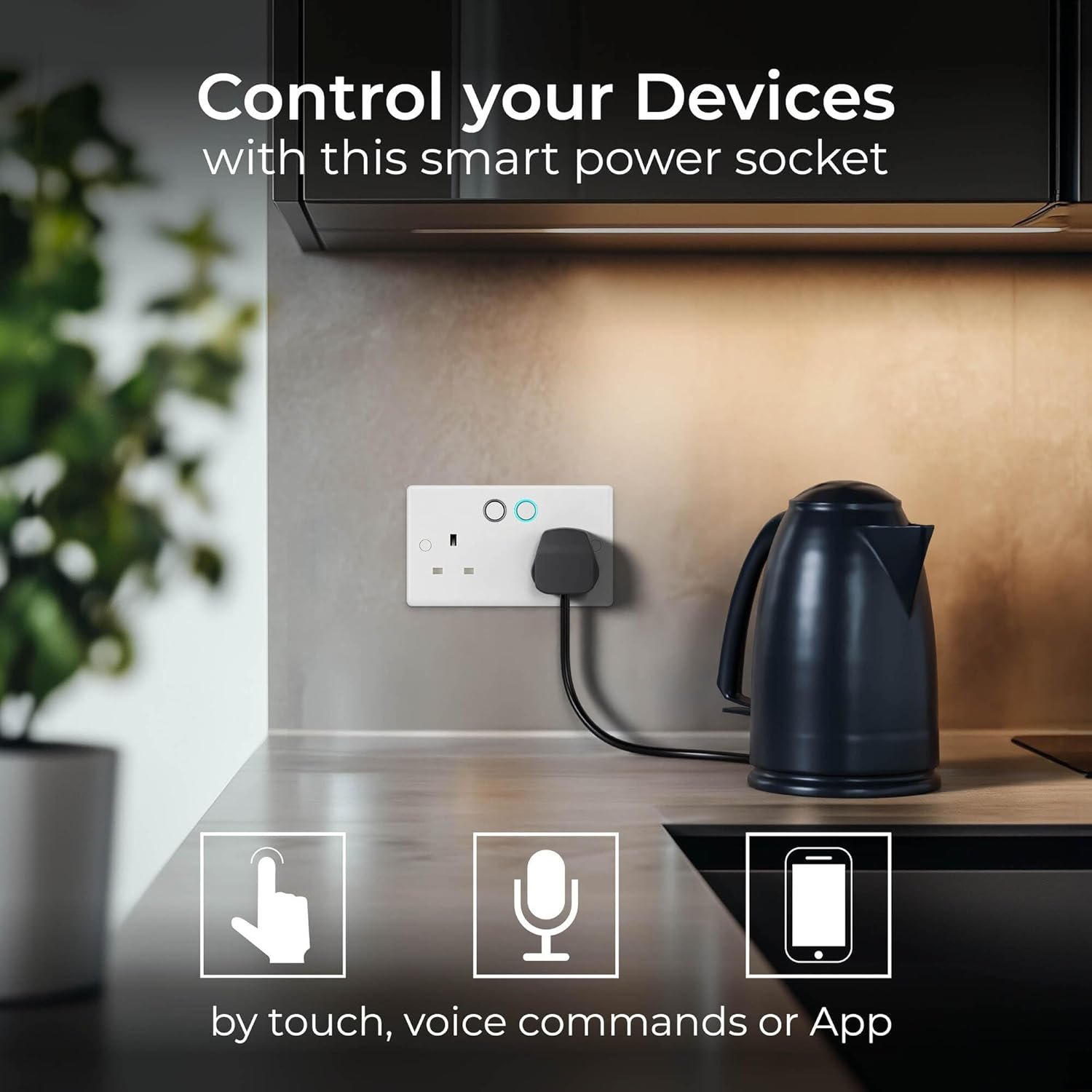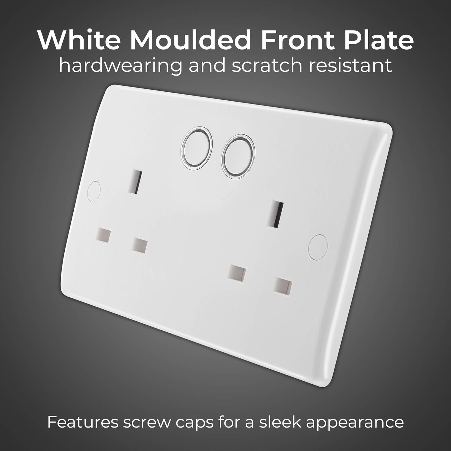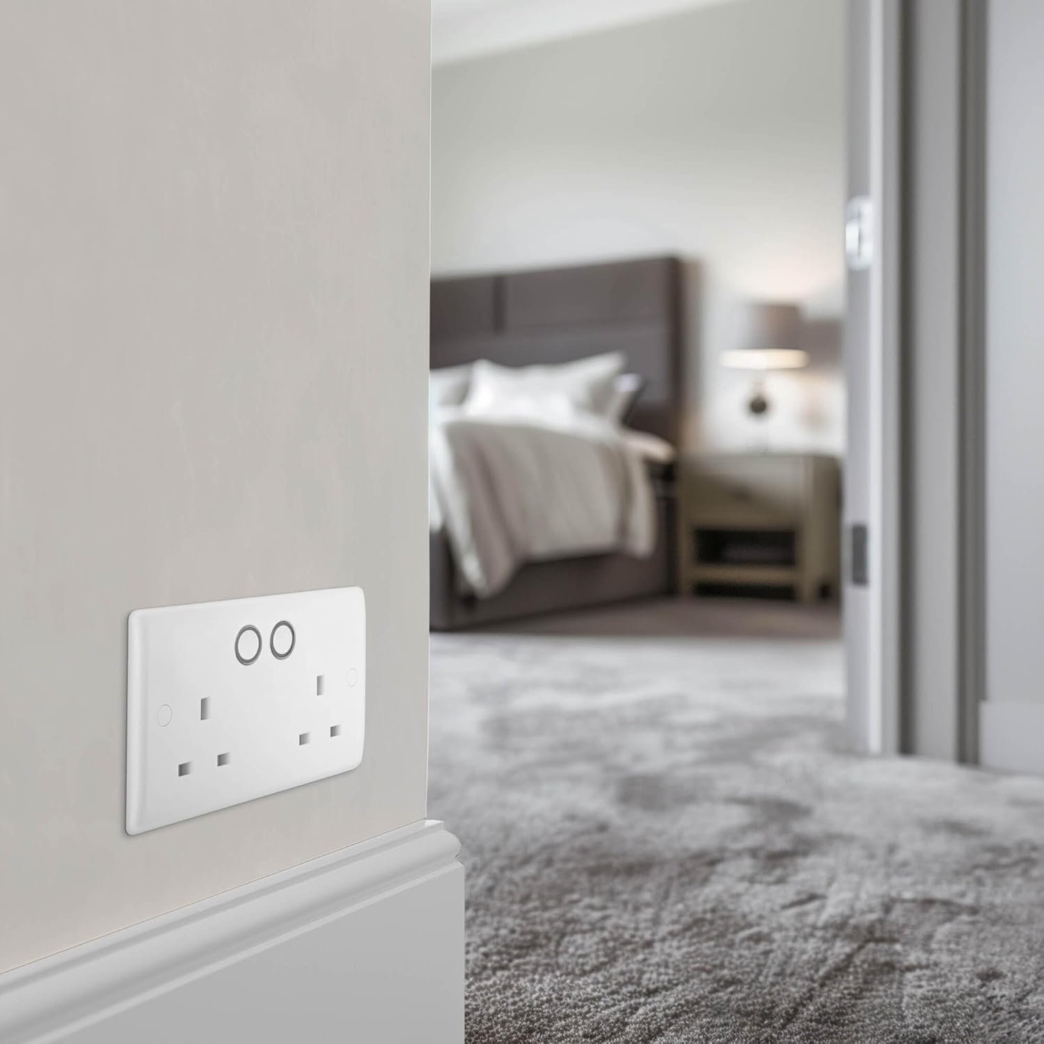 MODERN ROUND EDGED WHITE MOULDED 13A DOUBLE SWITCHED SMART HOME CONTROL POWER SOCKET: Slim, white-moulded exterior with stylish, rounded edges and colour-matched screw caps for subtle elegance. Compatible with Amazon Alexa, Hey Google and Siri