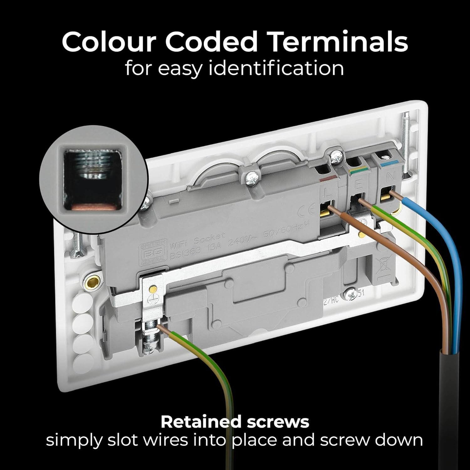 COLOUR CODED TERMINALS & CAPTIVE BACKED-OUT SCREWS: Easy wire connection and terminal screws to prevent screw loss. All fixings included. Minimum mounting box depth 25mm