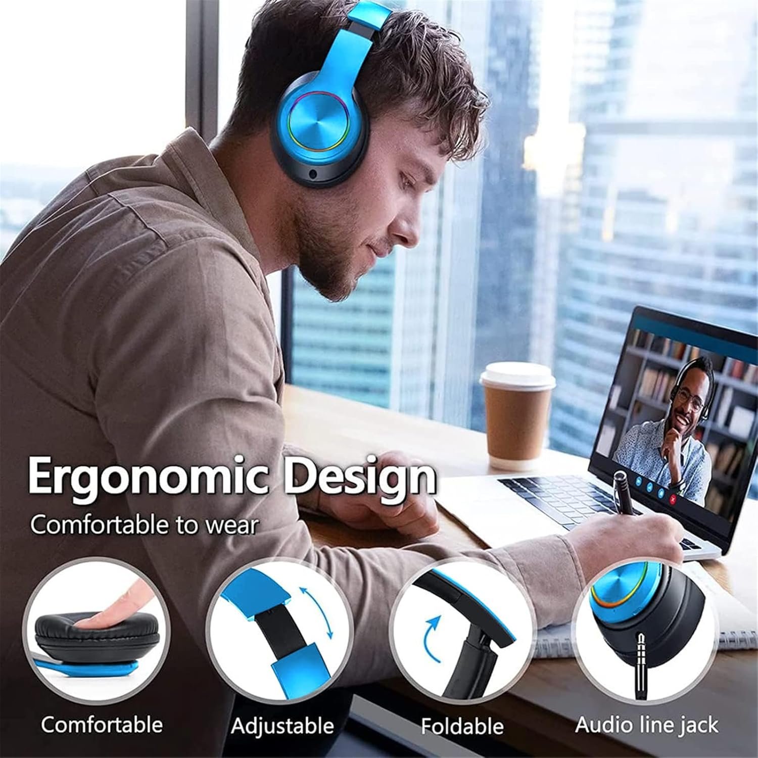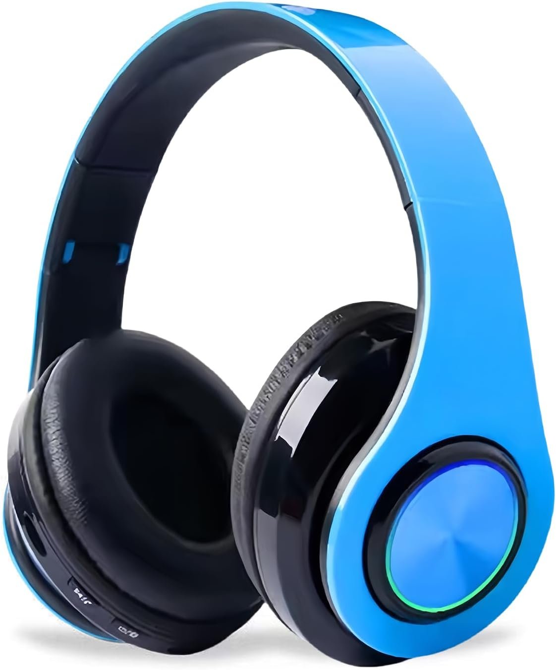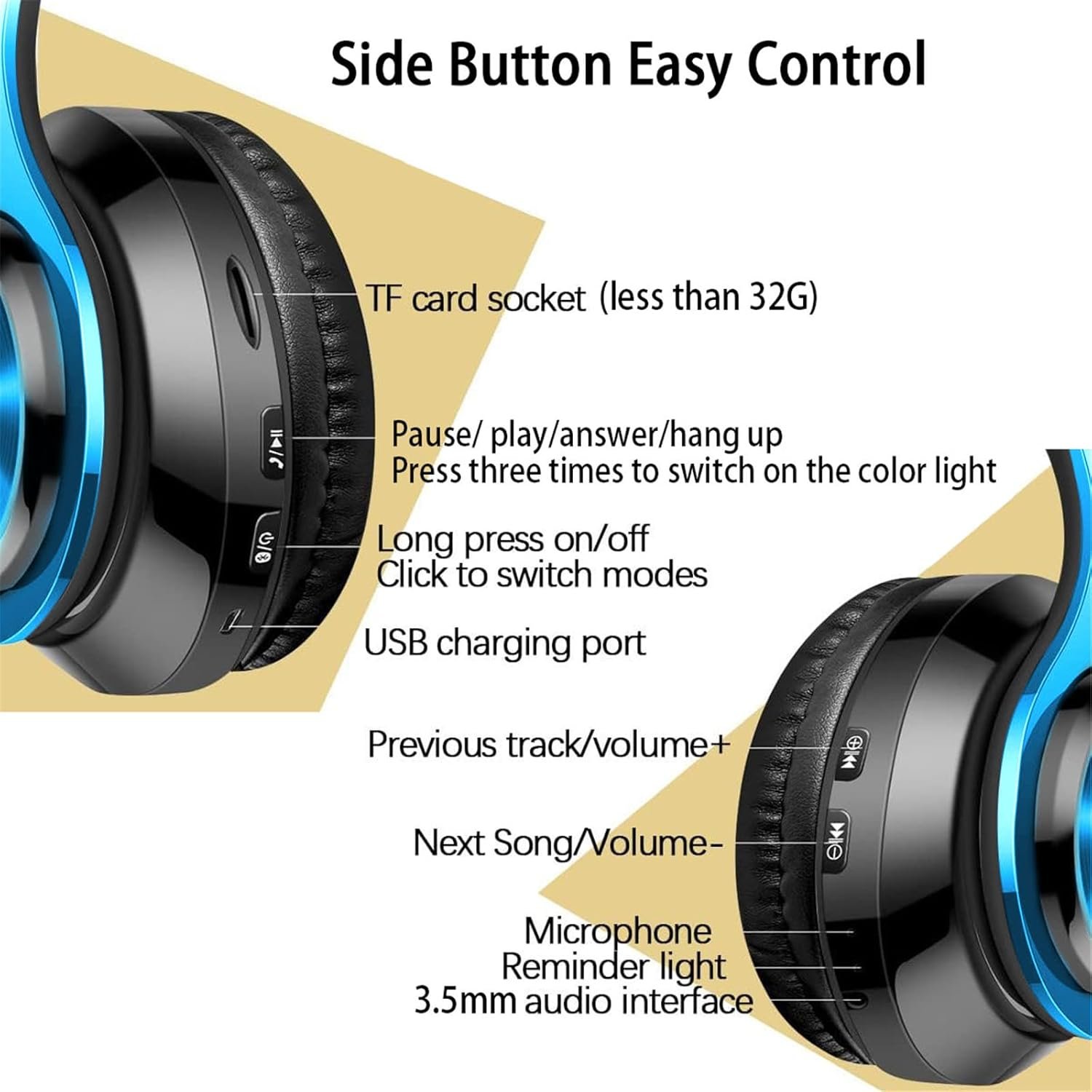 🎶【Wide Compatibility】: Simply press multi-function button 2s and the over ear headphones with mic will be in ready to pair. wireless headsets are compatible with all devices that support Bluetooth or 3.5 mm plug cables. They also feature a set of LED lights that run around the edges of the earpiece for an awesome, stylish look!