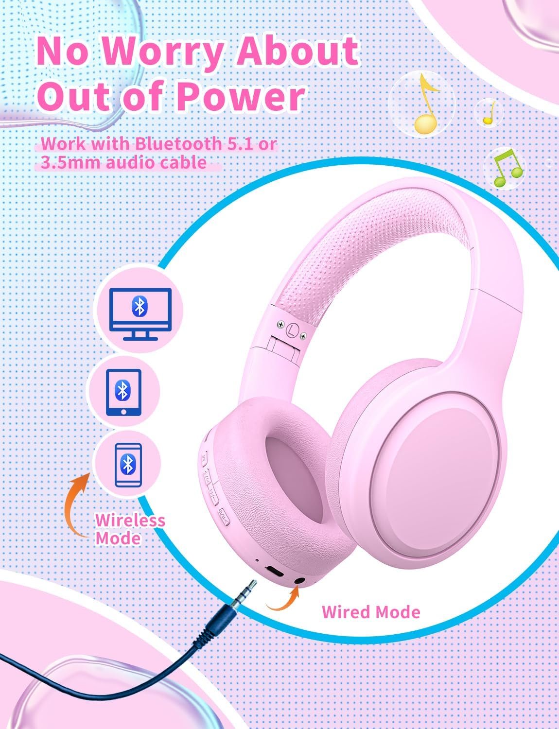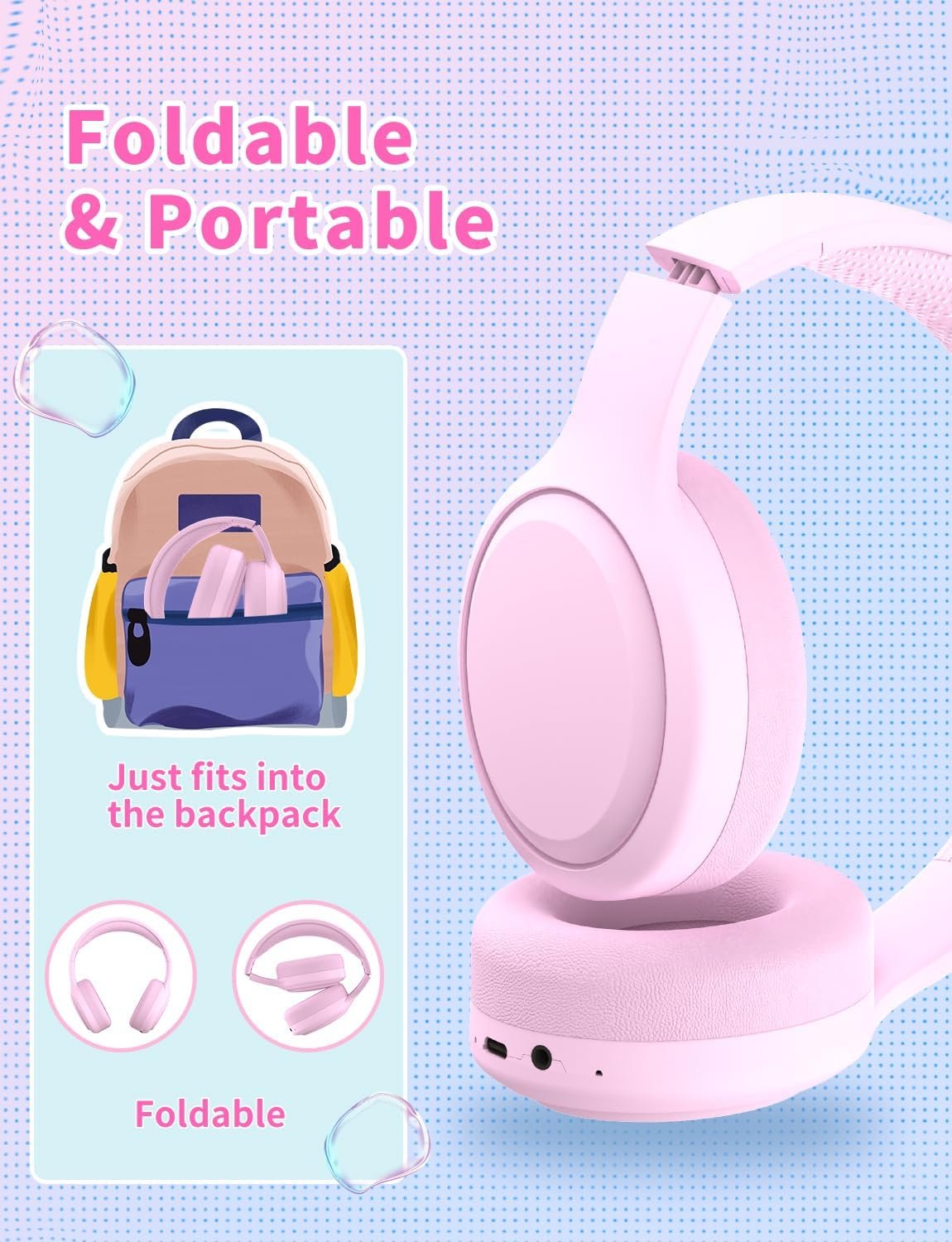 Kids Bluetooth Headphones,Foldable On Ear Wireless Headphone,Stereo Sound with MIC,10H Playtime,Bluetooth 5.3,Kids Wireless Headphones Over Ear for Kid Adult School Online Class (Pink)