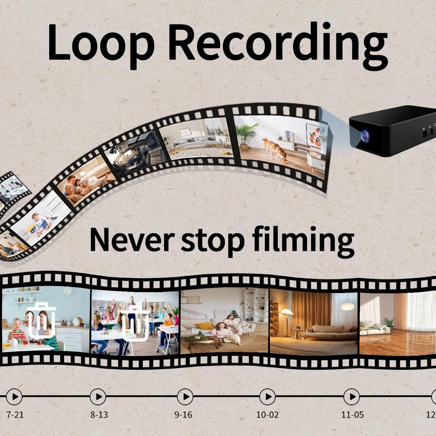 Motion Detection and Loop Recording: Mini camera has a clever motion detection recording mode. It activates to record videos only when motion is detected, saving storage space by avoiding unnecessary recordings. It is compatible with large capacity TF cards, providing more recording possibilities. The loop recording function ensures continuous monitoring, overwriting old videos with new ones. (The product is sold without TF card.)