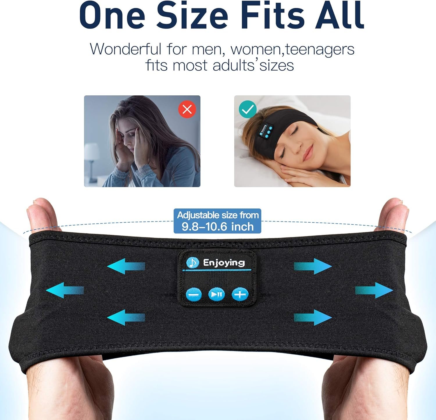 Comfortable soft elastic headband.One size fit most people.Earbuds Free Music, enjoy music and no worry earbuds may fall down.Falling asleep efficiently with your favorite music.