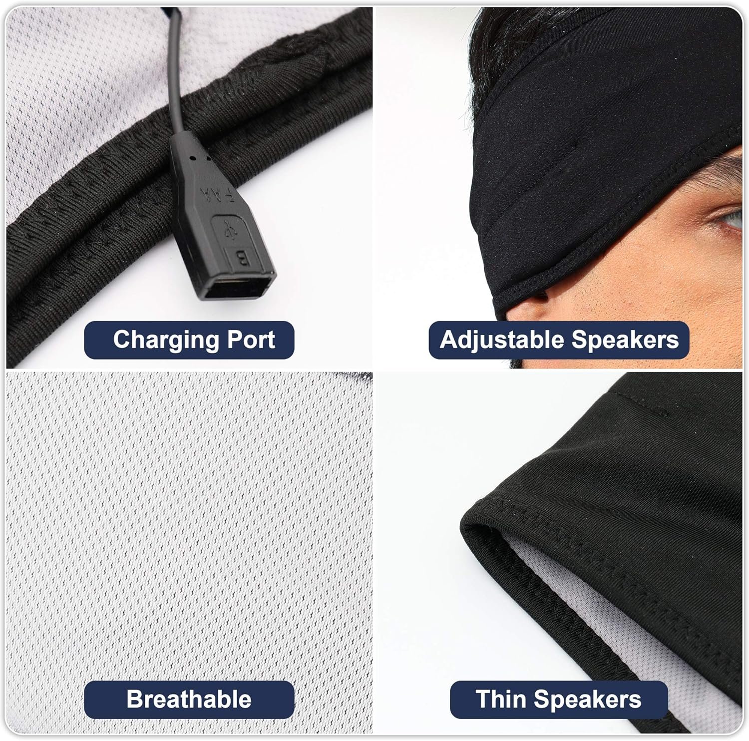 Longer battery life.Built-in 240mAh high-performance battery, Sleep Headphones Headband only charge about 2-2.5 hours and provide more than 8 hours playing time.If you fall asleep with it on and the battery runs down,this Sleep Headphones won’t beeps to wakes you up,you will have a very good sleeping.
